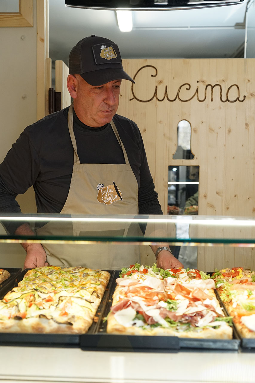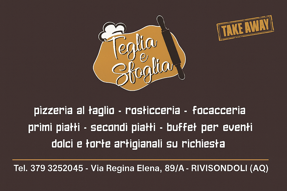 Teglia e Sfoglia è un attività situata nella zona centrale a Rivisondoli in Via Regina Elena, tutto quello che puoi desiderare; pizzeria al taglio, rosticceria, focacceria, primi piatti da asporto e secondi piatti, con possibilità di buffet per eventi, dolci e torte artigianali su richiesta. Vi aspettiamo, pronti ad accogliervi tutti per soddisfare al meglio le vostre esigenze.